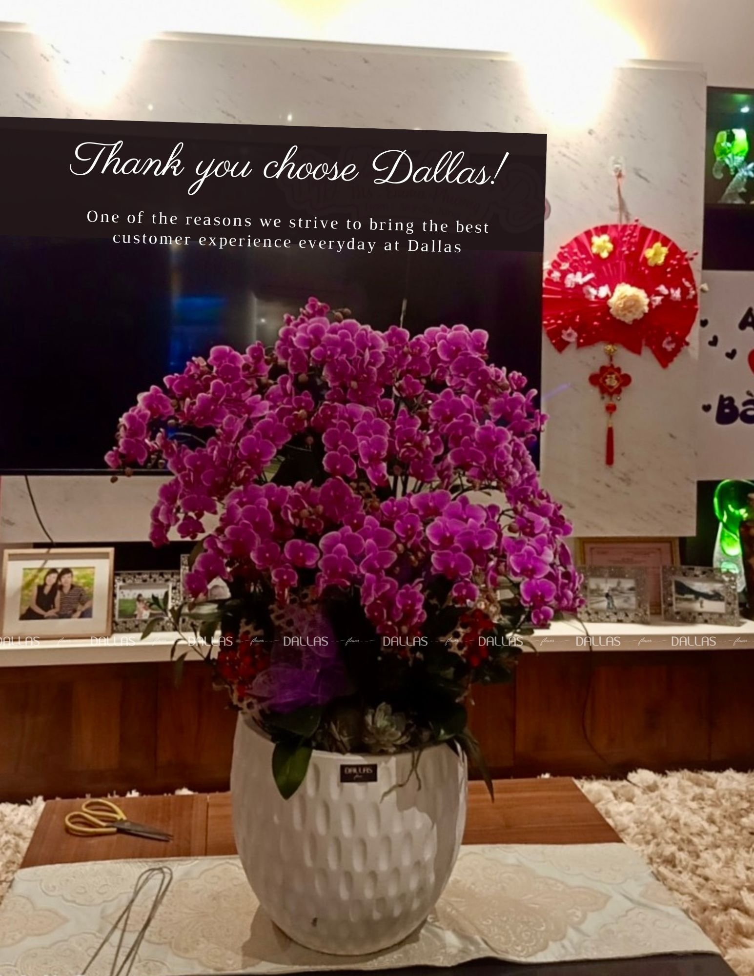 Ngoài ra, một số loại hoa trong mẫu theo mùa sẽ không có hoặc chất lượng không đảm bảo, do đó chúng tôi sẽ dùng các loại hoa khác thay thế. Nhưng Dallas Flower đảm bảo định lượng, kiểu dáng cũng như chất lượng hoa đẹp và đầy đặn nhất. Bạn sẽ nhận được ảnh hoàn thiện trước khi chúng tôi giao hoa.
