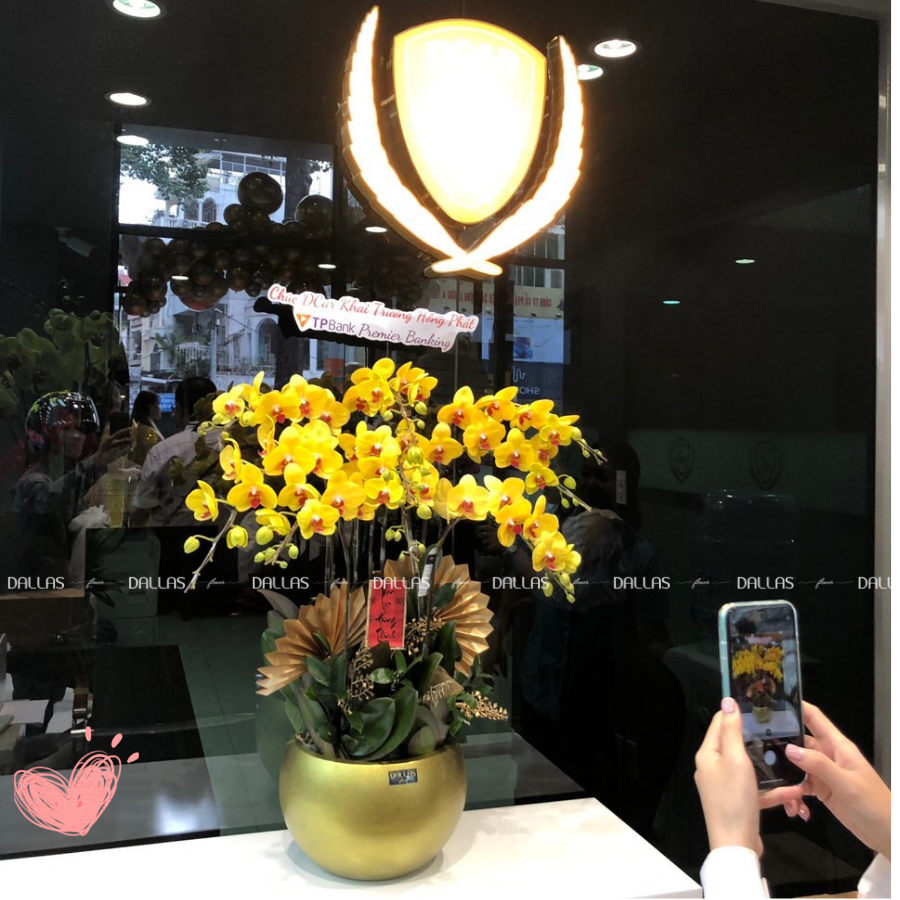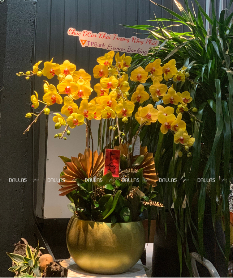 Chậu lan hồ điệp vàng là biểu tượng của sự sung túc, thịnh vượng và tài lộc cho gia chủ. Ngoài ra, màu vàng còn mang thông điệp của sự ấm áp, vui vẻ và lạc quan. Vì vây, Đây là màu sắc tuyệt vời để lựa chọn hoa trong dịp tặng khai trương, hoa chúc mừng sinh nhật hay hoa sinh nhật.