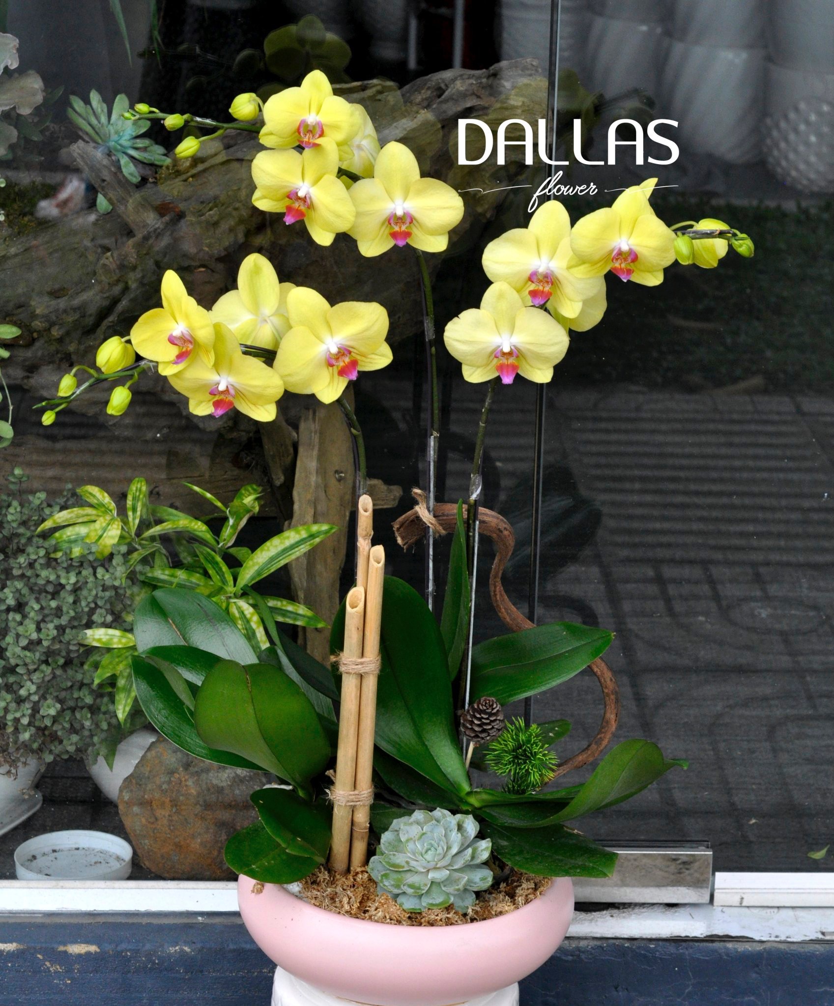 Chậu lan hồ điệp vàng là biểu tượng của sự sung túc, thịnh vượng và tài lộc cho gia chủ. Ngoài ra, màu vàng còn mang thông điệp của sự ấm áp, vui vẻ và lạc quan. Vì vây, Đây là màu sắc tuyệt vời để lựa chọn hoa trong dịp tặng khai trương, hoa chúc mừng sinh nhật hay hoa sinh nhật.